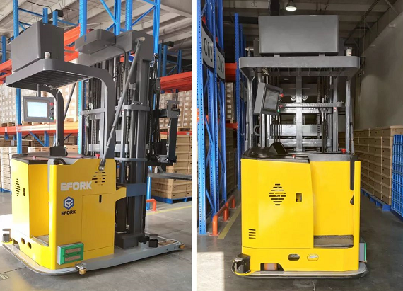 因此,宇鋒智能對(duì)三向堆垛叉車的車體結(jié)構(gòu)、三向堆垛頭進(jìn)行改造,并對(duì)其控制方式進(jìn)行升級(jí),自主研發(fā)了自動(dòng)導(dǎo)引三向堆垛叉車,使得其集普通AGV、電動(dòng)堆垛叉車、有軌堆垛機(jī)之優(yōu)點(diǎn)于一身,能夠解除貨架窄巷道對(duì)普通AGV空間范圍的限制,從而解決了其在窄道中難以轉(zhuǎn)向完成裝卸載貨物的難題。