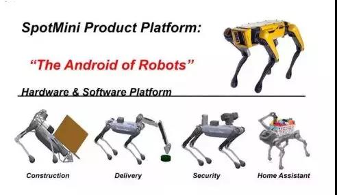 波士頓動力在提出商業(yè)化計劃的同時,也提出了一個更大膽的想法,其CEO Raibert 希望打造一個類似iOS和安卓操作系統(tǒng)的通用平臺。用戶會得到一個基本款的SpotMini,再與波士頓動力或第三方一起構(gòu)建硬件和軟件,例如手臂及其他組件等,從而無限拓展SpotMini的功能和應(yīng)用。例如SpotMini機器臂使用的擴展端口支持第三方設(shè)計和生產(chǎn)的附加工具,用戶可安裝攝像頭、傳感器等等,這樣按照客戶需求生產(chǎn)的SpotMini可以應(yīng)用在不同領(lǐng)域,面向廣大市場更加具有實用性。