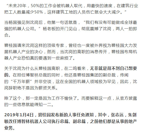 公開資料顯示,2018年7月1日沈崗正式加入碧桂園,擔(dān)任旗下的博智林機(jī)器人公司總裁一職。