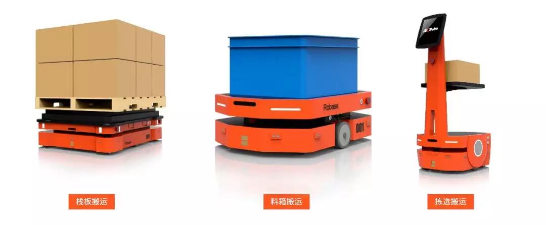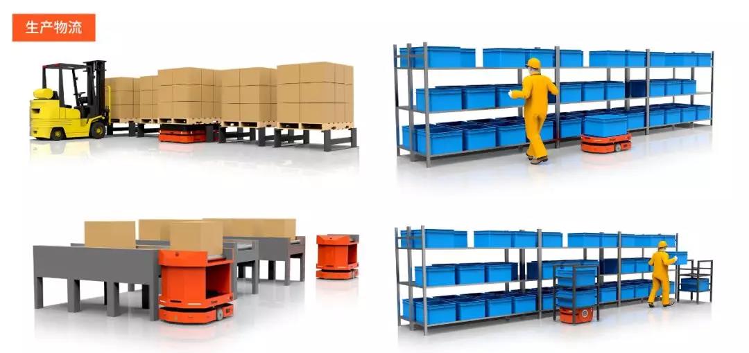據了解,在生產和倉儲作業場景當中,物料的運輸主要依托于棧板、料箱等工具,因此,隆博科技推出了棧板搬運、料箱搬運和揀選運輸的解決方案。