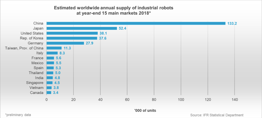 據全球機器人聯盟(IFR)2019年4月初發布的數據,中國2018年工業機器人供給量估量有133200臺,是第二大市場日本(52400臺)的兩倍多(見下圖所示)。