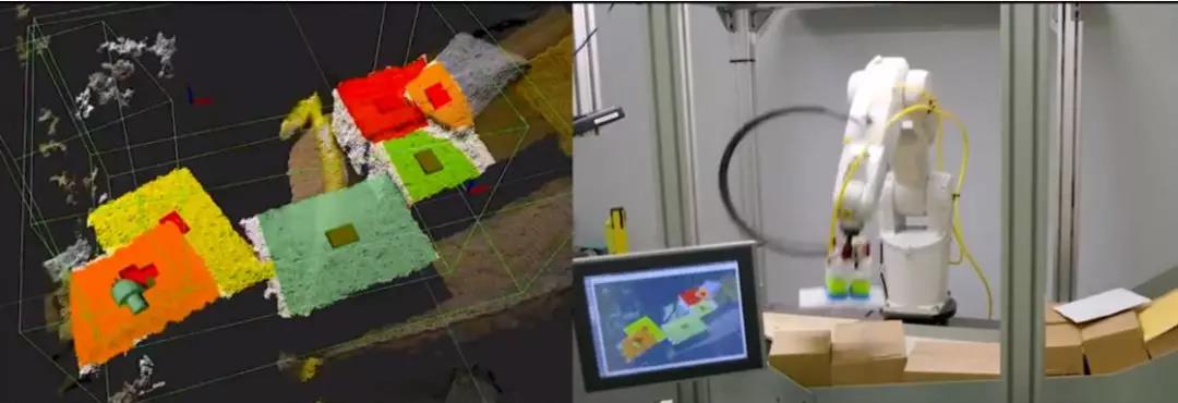 來自Plus One Robotics的PickOne機(jī)器人手臂。左側(cè)是機(jī)器人看到的視圖
