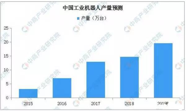 我國是工業(yè)機(jī)器人應(yīng)用大國,行業(yè)迅猛發(fā)展,產(chǎn)量持續(xù)增長。2015年產(chǎn)量僅32996臺。2017年突破13萬臺,提前三年實(shí)現(xiàn)了10萬臺產(chǎn)量的目標(biāo)。2018年全國工業(yè)機(jī)器人產(chǎn)量為147682臺,同比增長4.6%。預(yù)計2019年工業(yè)機(jī)器人產(chǎn)量將近20萬臺。