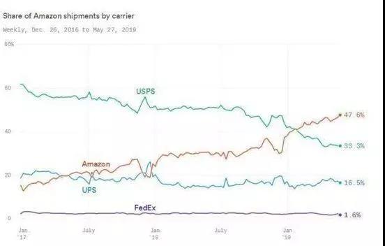 隨著自身運輸能力的提高,亞馬遜對聯邦快遞、UPS和美國郵政服務的依賴有所下降。美國郵政服務公司曾是亞馬遜包裹業務的主要承運商,如今遞送的包裹份額只是兩年前的一半。