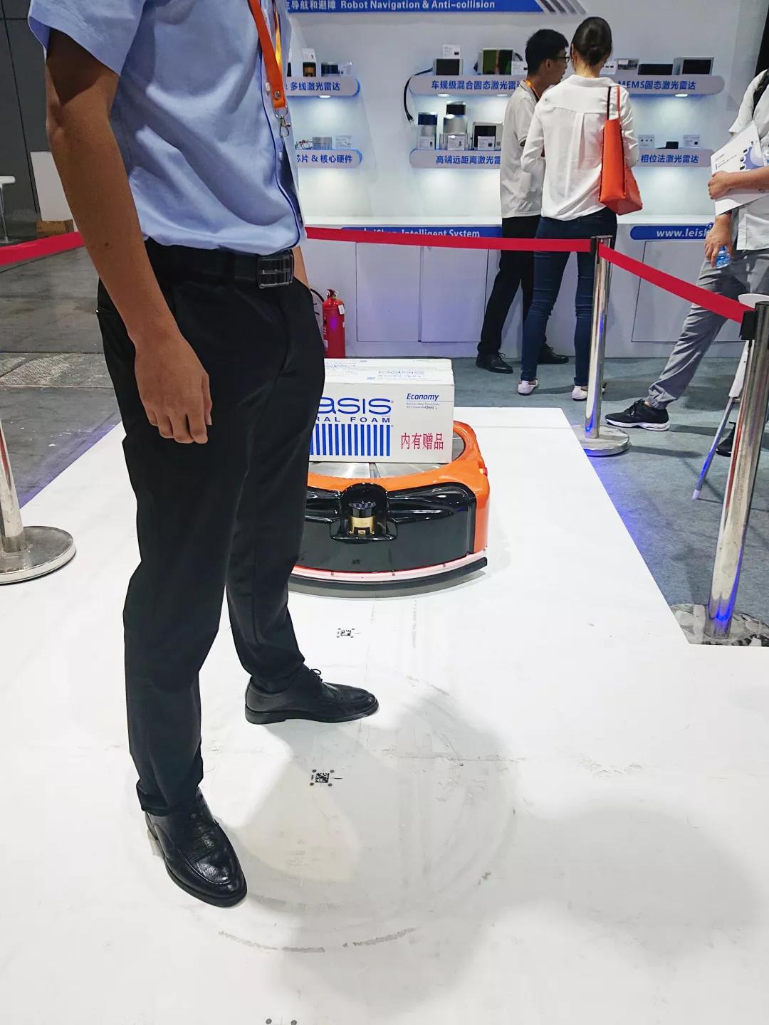 參展買家們正在觀看和體驗AGV機器人自主導航、避障應用演示