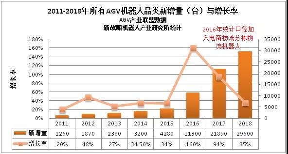 圖一: 2011-2018年AGV機器人產(chǎn)品新增量與增長率