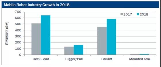 其中,潛伏式移動機器人占比較高,2018年銷售額為6.4億美元,自主導航叉車銷售額為5.8億美元,牽引式移動機器人銷售額為1.6億美元,而搭載了機械臂的復合機器人銷售額不到0.2億美元。
