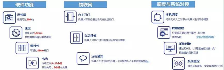 目前主要應用在手術室、住院病區(qū),負責手術室無菌包、藥品、母乳、靜脈輸液包、標本等的物流工作。通過定制貨柜,進行配餐、醫(yī)療垃圾、被服等的配送。