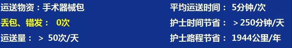 深圳市寶安區(qū)婦幼保健院目前在住院藥房、手術室、PIVAS(門診)、檢驗科、母乳庫、智能消毒、食堂七個場景已安排物流機器人進行配送。主要進行急診靜脈用藥配送、檢驗科標本運送、住院部藥品運送、智能消毒、餐飲運送、被服運輸配送。在實際應用中實現(xiàn)物資運送平均5分鐘/次,物資錯發(fā)/丟包0次,每天運送量超過50次,每天為醫(yī)院護士節(jié)省時間250分鐘,機器人每月行走超600公里,每年為護士節(jié)省1944公里路程。