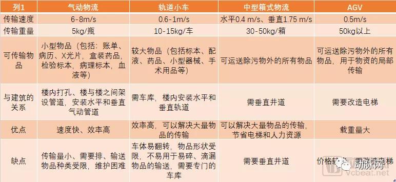 對于醫(yī)院來說,快捷、準(zhǔn)確、自動、安全地實現(xiàn)物資運送,是主要的述求。現(xiàn)階段醫(yī)院常采用的物流系統(tǒng)主要包括醫(yī)用氣動物流系統(tǒng)、軌道小車物流系統(tǒng)、中型箱式物流系統(tǒng)和AGV機(jī)器人,不同類型的技術(shù)出現(xiàn)滿足了醫(yī)院對不同物資在速度和重量上的需求。