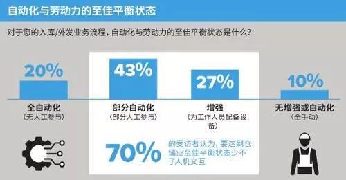 《報告》顯示,決策者認為自動化和人工需要相互配合才能實現最高效率。70%的受訪者認為工作流程始終需要人工的參與,在這些受訪者中,43%認為在工作人員的例行工作中加入自動化元素可以讓倉庫運營取得至佳狀態。