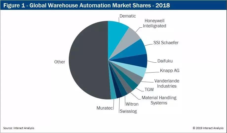 單從2018年世界智能倉儲物流市場占有率來看,德瑪泰克和霍尼韋爾Intelligrated是目前此領域的佼佼者。