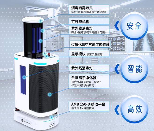 該款“消毒機器人”以仙知AMB系列無人搬運底盤為載體,集成紫外線消毒燈、超干霧過氧化氫、負氧離子凈化器三種消毒方式于一體,特別適用對消毒滅菌要求較高的負壓隔離病房、隔離緩沖區、重癥監護室、手術室、發熱門診、接待室、檢驗科、實驗室、取樣間及物料傳遞間等密閉空間,以及機場、火車站、商場、寫字樓、教學樓等場合,通過無人化接觸消毒有效減少病毒交叉感染,實現消毒過程智能量化管理。