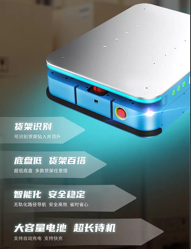 具體優(yōu)勢:超低底盤,多款貨架任意搭配;速度快,效率提升;超快速度,最快 2s 即可到達(dá)頂升限位;智能化,安全穩(wěn)定;無軌化路徑導(dǎo)航,安全高效,省時省心;大容量電池,超長待機;支持自動充電,支持快充;