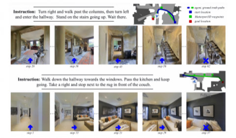 研究小組將這些環境提煉成4475條由4到6個節點組成的軌跡,這些軌跡對應于在各個位置拍攝的360度全景圖像,顯示了導航能力。