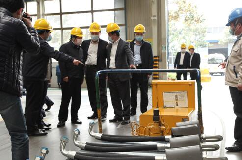 譚旭光一行先后參觀了臨工集團裝載機事業部總裝一車間、零部件事業部主控閥車間、挖掘機事業部智能制造車間和總裝流水線。
