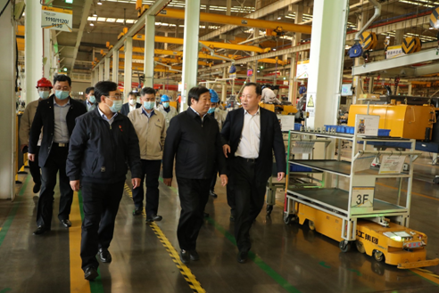 參觀過程中,董事長王志中介紹了臨工集團近年來的發展情況,尤其是精益生產和工業自動化產品自主研發方面取得的重要成果。譚旭光邊走邊看,不時駐足詢問交流,對公司取得的發展成績表示充分肯定,對臨工集團自主研發并大量應用、遍布生產現場的AGV智能轉運車及各類智能機械手、焊接機器人等研發應用成果給予高度贊賞。