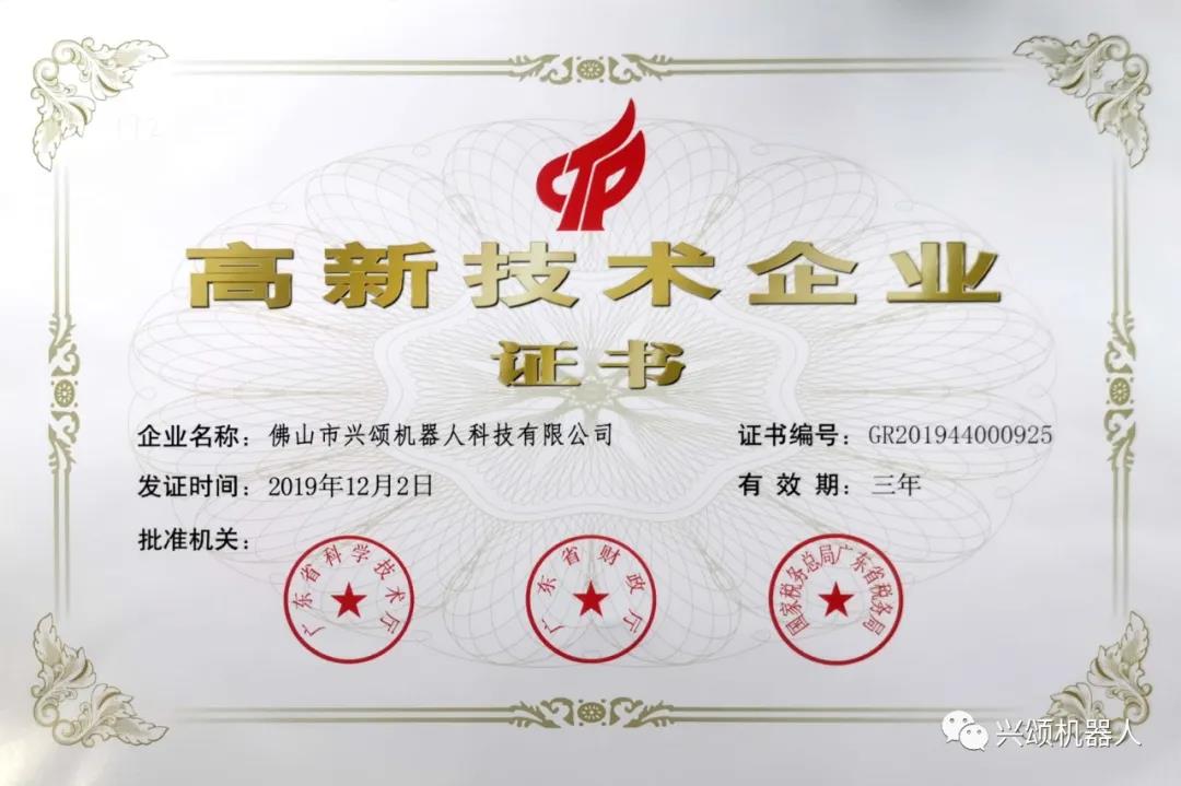 經(jīng)全國高新技術(shù)企業(yè)認定管理工作領(lǐng)導小組辦公室《關(guān)于廣東省2019年第一批高新技術(shù)企業(yè)備案的復函》的批復,公布了廣東省2019年第一批高新技術(shù)企業(yè)名單,興頌機器人順利通過評審,獲得國家“高新技術(shù)企業(yè)”認證。