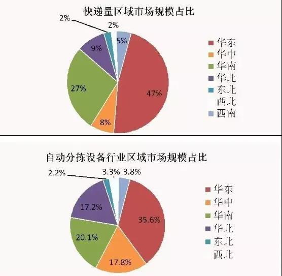 我國(guó)自動(dòng)分揀設(shè)備市場(chǎng)區(qū)域分布情況與電商快遞數(shù)量分布情況高度正相關(guān),以浙江、江蘇、上海為代表的華東區(qū)域及以廣東為代表的華南區(qū)域市場(chǎng)份額巨大,自動(dòng)分揀設(shè)備市場(chǎng)規(guī)模更大、技術(shù)發(fā)展更快, 其中華東地區(qū)以超過(guò)35%的市場(chǎng)份額位穩(wěn)居首位,區(qū)域市場(chǎng)規(guī)模效應(yīng)明顯。