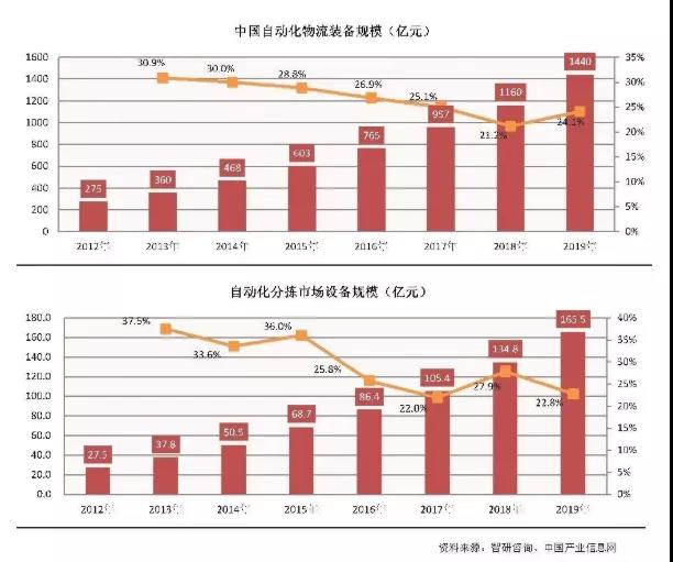 中國(guó)的自動(dòng)分揀設(shè)備系統(tǒng)得益于電商、快遞行業(yè)的蓬勃發(fā)展及制造業(yè)的龐大市場(chǎng)需求潛力,我國(guó)自動(dòng)分揀設(shè)備市場(chǎng)一直保持著極高速增長(zhǎng)狀態(tài)。 據(jù)統(tǒng)計(jì),2019年我國(guó)自動(dòng)化物流裝備市場(chǎng)規(guī)模約1440億元,年度增長(zhǎng)率約24.1%,其中自動(dòng)化分揀設(shè)備市場(chǎng)規(guī)模約165.5億元,年度增長(zhǎng)率約22.8%,雖然2019年市場(chǎng)增速減緩,略低于整體自動(dòng)化物流裝備增速,但自2012年以來(lái),自動(dòng)分揀設(shè)備市場(chǎng)近7年復(fù)合增長(zhǎng)率達(dá)到29.2%,明顯高于行業(yè)26.7%的增速。