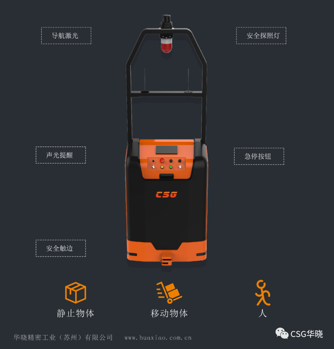 為降低AGV在作業(yè)過程中的風險,保證現(xiàn)場人員和貨物的安全,華鵬W系舵輪式地牛叉車AGV搭載多級安全措施,支持多種傳感器的安全防護,包括導航激光、安全探照燈、聲光提醒、安全觸邊、急停等,可自主識別周圍環(huán)境,有效避讓靜止物體、移動物體和人。