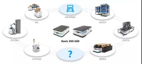 目前,斯坦德旗下產品有Oasis 300/Oasis600UL兩款標準化移動平臺,Oasis系列基于自然無軌導航技術,無需場景改造,能夠自動生成環境地圖,實現調度規劃快速部署。此外,Oasis可以搭載協作機器人、錕臺、自動充電樁、定制頂部模塊、貨架頂升、棧板搬運、核心控制器等,定位精度為mm級,適應環境動態變化,在標準化的調度系統下完成路徑規劃和交通調度,充當“順風車、專車”的角色,實現跨樓層、跨廠房運作。