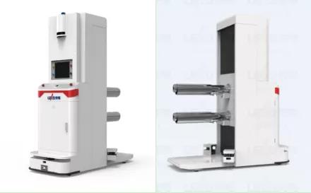 以卷料上下料為例,一般通過OHT(人工助力臂)或者人工轉運小車實現,為了提升工序的自動化水平,先導自主研發了料卷自動上下料AGV。該款AGV采用獨特的四組驅動全向底盤運動控制,實現車體的全向運行,解決了場地受限和車體晃動等行業難題。同時,通過多軸復合調整機構,距離檢測傳感器和視覺檢測,對轉塔旋轉誤差和懸臂軸撓度進行補償,實現±1mm的高精度對接,以達到AGV和模切機、卷繞機等設備自動對接,實現了模切-疊片段/分切-卷繞段的物流無人自動化,為全球首創。