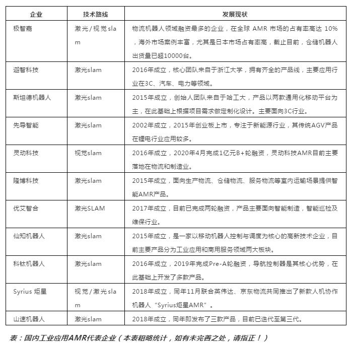 除了上述表中這些專注于AMR的企業之外,傳統AGV企業和一些倉儲機器人廠商也在開發相關的產品。AMR被認為是未來物流搬運的方向,目前在3C制造等一些領域也已經實現了初步的規模化應用,2019年AMR在工業領域應用的產品市場保有量突破1600臺。