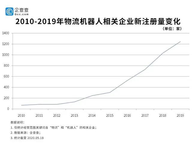 企查查截取了2010-2019年物流機(jī)器人相關(guān)企業(yè)新注冊量變化數(shù)據(jù),發(fā)現(xiàn)自2013年后,物流機(jī)器人發(fā)展呈逐年直線上升趨勢。2019年物流機(jī)器人相關(guān)企業(yè)新注冊量與2018年相比,同比增長20.5%。且隨著物流體系的不斷完善,物流機(jī)器人企業(yè)數(shù)量將在未來幾年內(nèi)持續(xù)速度增長。