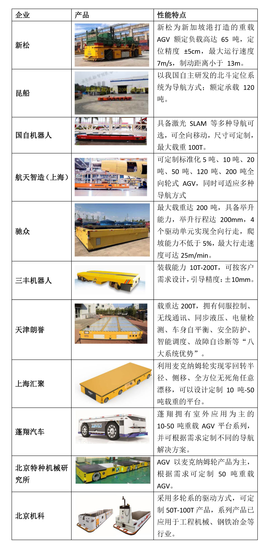 在大型設備和產品運輸要求越來越嚴格的場景下,AGV的構造和承載也發生了變化,重載AGV應運而生,開始進入市場應用。負重量是重載AGV主要的技術衡量指標,一般而言,目前室內用的重載AGV負重大部分在10噸以內,部分室內外通用的負重在10噸到50噸之間,負載越大對于技術的要求越高,當然,一般場景也不一定要求非常高的載重,因此能夠做到50噸及以上的AGV,目前還并不多。