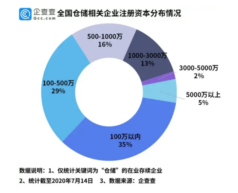 注冊資本方面,企查查數據顯示,倉儲相關企業的注冊資本主要集中在在100萬以內和100-500萬這兩個區間,分別占總量的35%和29%,而注冊資本在5000萬以上的僅占5%。